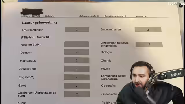 00:03:33Ein Hauptthema des Streams ist das Betrachten von Zuschauerzeugnissen. Der Streamer beginnt damit, das Zeugnis eines Schülers vom Gymnasium zu analysieren, bei Noten wie 'Deutsch 4' oder 'Kunst 2'. Es kommt zu humorvollen und teilweise sarkastischen Kommentaren, wie etwa 'du kleiner Bastard' bei guten Noten in Fächern wie Musik. Es werden auch Zeugnisse von Förderschülern und Realschülern gezeigt, was zu einer Diskussion über den Schulsystemwechsel und die Bewertung von akademischem Erfolg führt. Das Thema wird von Kunstbetrachtungen unterbrochen.