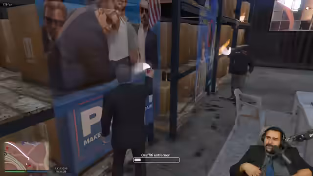 03:12:08Der Streamer kündigt an, die Gruppe zu einem bestimmten Ort zu fahren, wo sie alle gleichzeitig aussteigen und eine Wand mit einem speziellen Graffiti besprühen sollen: zwei Hand in Hand haltende Flüchtlinge, die bereits vor dem Flüchtlingsheim zu sehen sind. Er betont, dass dies ein Zeichen für Menschen in Not sein soll und sie dies am PD (Police Department) tun werden. Trotz Bedenken der Flüchtlinge, dass sie dann „gefickt“ seien, besteht er darauf, es als Kunstprojekt oder Plakat auszugeben. Nach der Ankunft am PD stürmen alle los und beginnen, die Wände zu besprühen. Die Polizei greift ein, es kommt zu einer Verfolgungsjagd, bei der der Streamer und einige Flüchtlinge entkommen, während andere festgenommen werden.