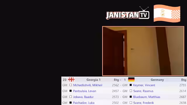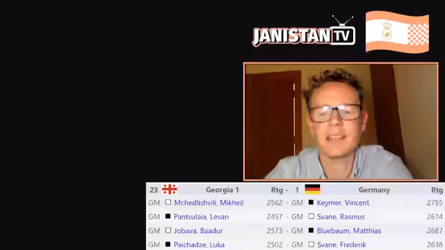 00:22:54Der Streamer meldet sich von der Mannschaftseuropameisterschaft in Batumi, Georgien, und gibt einen kurzen Überblick zur dritten Runde. Deutschland traf hier auf die Topmannschaft Georgiens. Nach einer kurzen Mannschaftssitzung fasst der Streamer die Paarungen zusammen: Vincent Keymer spielte mit Schwarz gegen Shako Shatili, Rasmus Warne mit Weiß gegen Baadur Jobava und Matthias Blübaum ebenfalls mit Schwarz gegen Baadur Jobava, während Luca Pajetsch mit Schwarz gegen Frederik Rasmussen antrat. Die Partien wurden nach einer ungewöhnlichen Regel erst am nächsten Morgen offiziell bekannt gegeben.