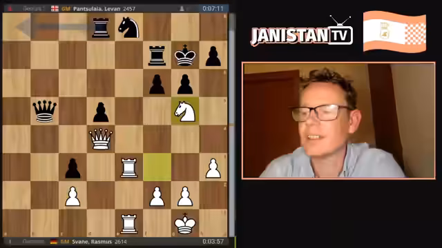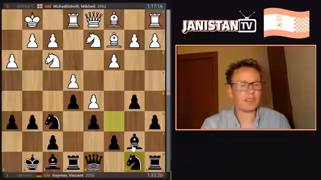 00:30:12Matthias Blübaum, der Kandidatenqualifikant, spielte mit den schwarzen Steinen gegen Baadur Jobava. Nach einer soliden Eröffnung schien Blübaum zunächst keinen Nachteil zu haben. Der Streamer beschreibt, wie Blübaum im weiteren Verlauf der Partie den Faden verlor, objektiv schlechter stand und unter starkem Druck geriet. Ein Fehler in der Verteidigung führte dazu, dass Jobavas Figuren zentral zersplittert. Blübaum, der auch mit der Uhr haderte, gab die Partie schließlich auf, als eine kombinierte Dame- und Springerangriffsfalle nicht mehr zu parieren war und das Match wieder ausgeglichener gestaltete.