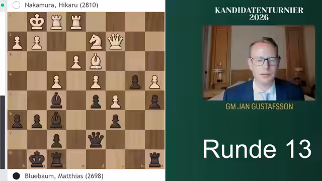 00:19:36Das Spiel zwischen Blübaum und Nakamura erreicht eine Phase des strategischen Patts. Blübaum hat mit seinen doppelten f-Bauern eine feste und schwer anzugreifende Stellung aufgebaut. Nakamurs einziger Plan ist der Versuch, mit einem Bauernvorstoß nach G4 einen Durchbruch zu erzwingen, doch Blübaum kontert effektiv mit Bauernzug nach H5. Die taktischen Möglichkeiten auf beiden Seiten sind begrenzt, und das neigt sich einer Punkteteilung zu. Im 41. Zug bietet Nakamura das Remis an, da er keine motivierenden Züge mehr sieht und sich mit dem halben Punkt zufriedengibt.