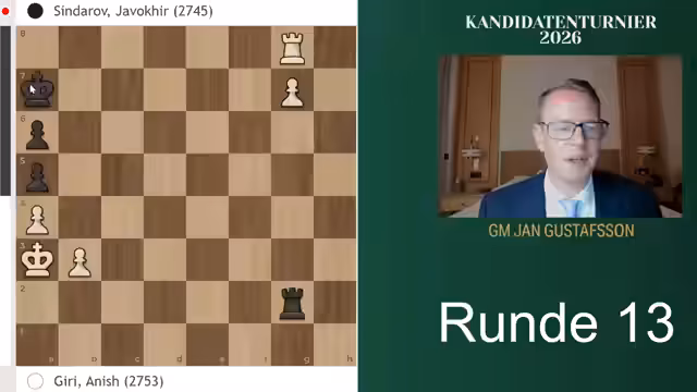 00:13:04Sindarov reagiert auf Giris Druck mit einem präzisen Gegenplan. Er tauscht Damen ab, um Giris Angriff zu entschärfen, und akzeptiert dabei bewusst Doppelbauern. Diese Entscheidung zeigt sein tiefes strategisches Verständnis und seine Fähigkeit, kompromisslos für Remis zu spielen. Die folgende Phase der Partie ist von geduldiger Verteidigung und abwartenden Zügen geprägt. Giri erzeugt zwar weiterhin Druck, kann aber keine entscheidende Schwäche in Sindarovs Stellung finden. Am Ende gelingt es Sindarov, das Spiel zu einem sauberen Remis zu führen und sich damit für die Weltmeisterschaft zu qualifizieren.