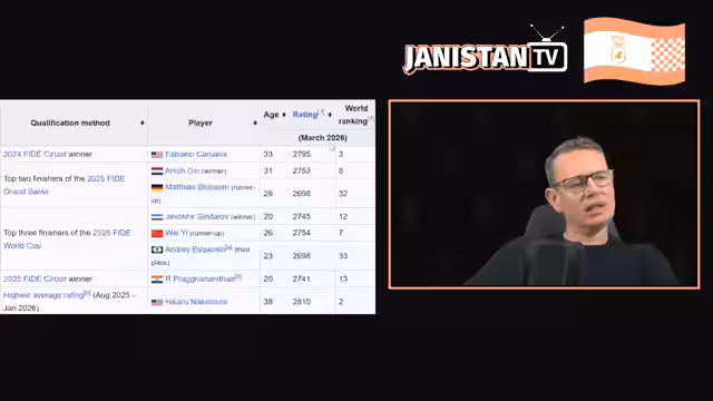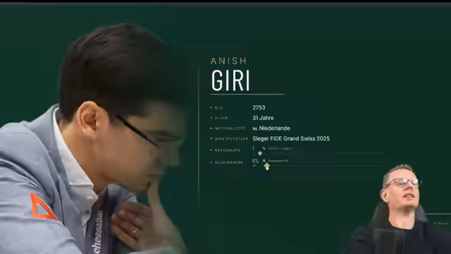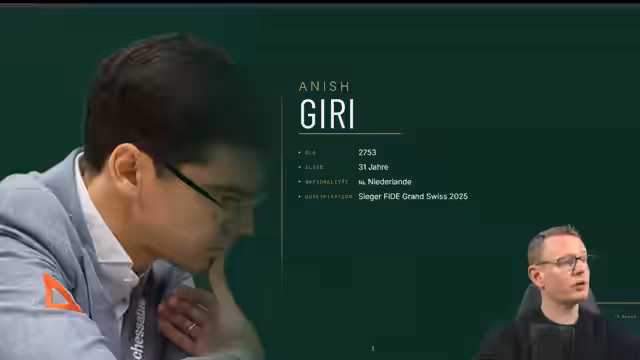 01:42:19Die Vorschau auf Anish Giri beginnt mit seiner Vorstellung als gesetzt an Position vier mit einer Elo von 2753. Seine Qualifikation über den Grand Swiss 2025, bei dem Matthias Blübaum Zweiter wurde, wird erwähnt. Seine Karriere, beginnend mit der Großmeister-Titelung im Jahr 2009 im Alter von 14, und sein erster großer Sieg gegen Magnus Carlsen im Jahr 2011 werden kurz beleuchtet.