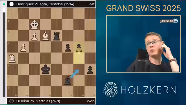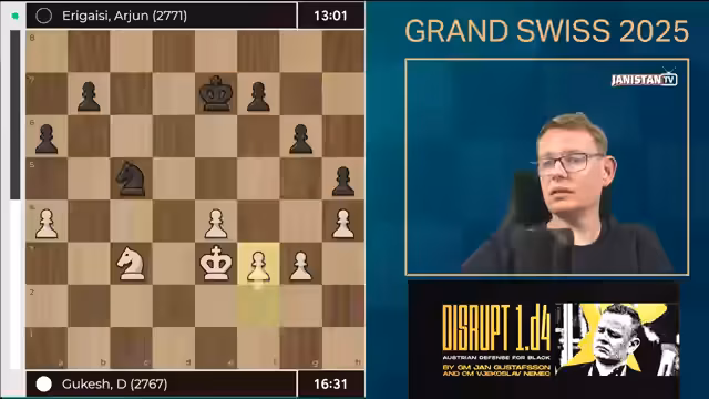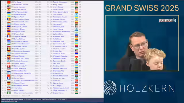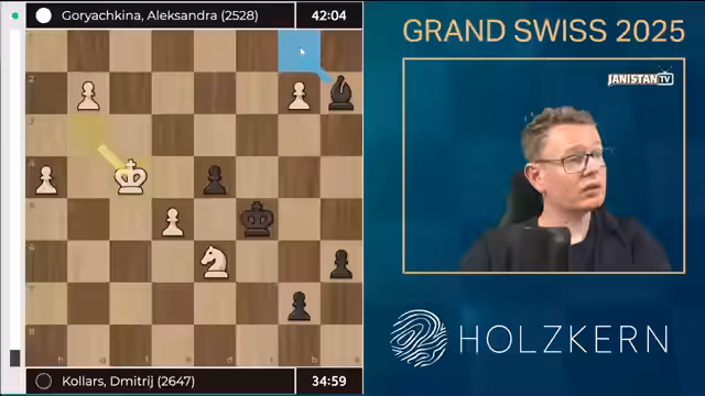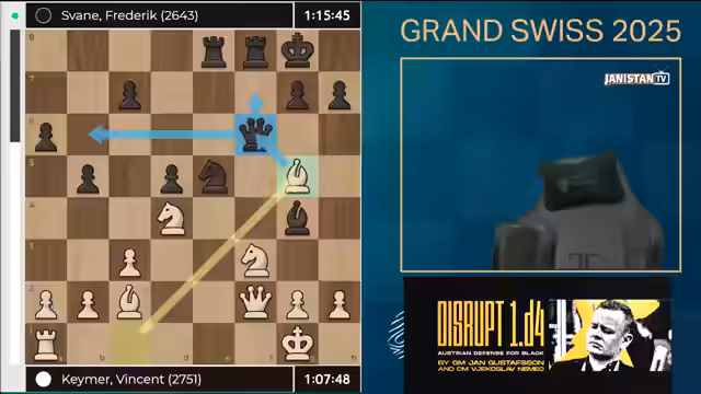 01:34:16Das Grand Swiss Turnier 2025 ist ein entscheidender Schritt zum Schachweltmeistertitel, da die ersten beiden für das Kandidatenturnier qualifizieren, das über ein WM-Match gegen Weltmeister Gukas entscheidet. Aktuell sind drei der acht Plätze besetzt: Caruana über den Fide Circuit 2024, Nakamura über den Rating Spot und Prag als Spitzenreiter im Fide Circuit 2025. Die verbleibenden fünf Plätze werden durch das Grand Swiss (zwei) und den World Cup (drei) vergeben. In Runde 4 trifft Vincent Keimer auf Frederik Svane, der einen frühen Zugfehler machte und schlecht steht, wodurch Keimer gute Chancen hat, in der Spitzengruppe zu bleiben.