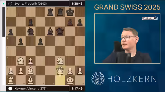 03:15:13Die Partie entwickelt sich aus einem Theorie-Duell im offenen Spanier. Keymer überrascht mit dem Zug E4, und Svane antwortet mit einem Tausch von Springer und Läufer gegen Turm und Bauern. Ein kritischer Moment entsteht, als Svane möglicherweise zu schnell Dame schlägt F6 spielt, worauf Keymer mit Dame nach F1 kontert und Druck aufsetzt. Die Analyse zeigt, dass Svane durch eine spätere Fehlentscheidung in der Zugfolge Weiß eine klare Initiative verschafft hat, auch wenn die Partie weiterhin komplex bleibt.