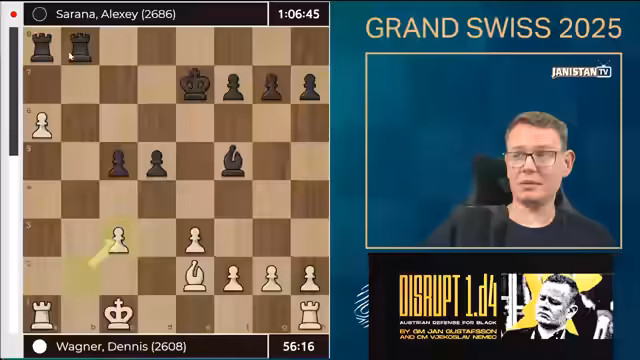01:39:48Bei Dimitri Kollas steht die Partie gegen Goyatchkiner minimal schlecht, da seine Läuferstruktur eingeschränkt ist, während Weiß mehr Flexibilität hat. Ein Unentschieden ist wahrscheinlich. Alexander Donchenko (1,5/3) und Dennis Wagner (0,5/3) zeigen unterschiedliche Ergebnisse; Wagner setzt den ehemaligen Europameister Sarana unter Druck. Matthias Blühbaum kämpft in einer komplexen Stellung, in der er seinen König sichert und versucht, im Zentrum zu bleiben, während Frederik Svane nach seinem Zugfehler kaum Chancen sieht.
