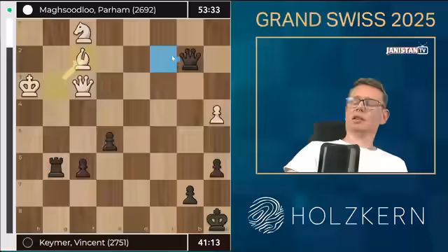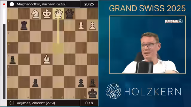 00:00:04The stream begins with a focus on Grand Swiss Round 9, highlighting the top-board games between Vincent Keimer and Matthias Blühbaum. Initial analysis covers Keimer's calculated moves and Blühbaum's steady defense, with the chat noting the psychological play and complex positions. Key sequences around moves 30-40 show Blühbaum neutralizing threats while under pressure from Lodebeck. The atmosphere is tense as both players navigate intricate endgames, with Blühbaum maintaining a drawish position despite Keimer's attempts to create winning chances.