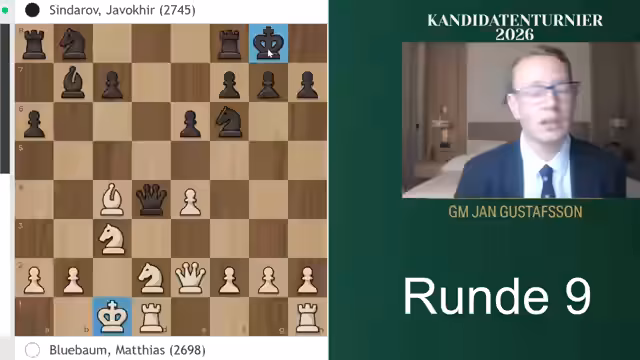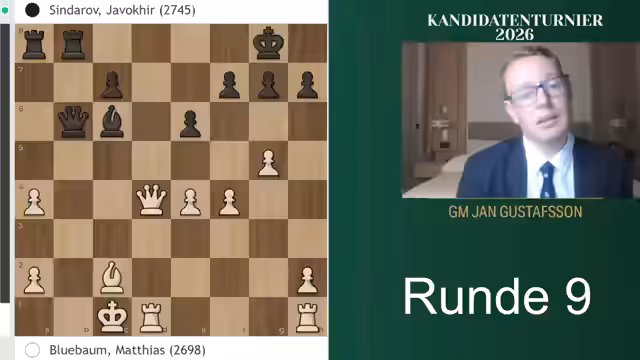 00:20:00Nachdem die Damen getauscht sind, zeigt Blübaum bemerkenswerte Verteidigungshärte. Er stellt die Stellung sicher und verhindert jede Initiative von Sindarov. Durch präzises Figurenspiel und vorausschauendes Bauernhandwerk zieht er das Spiel in Richtung Remis. Sindarov spielt mit Sicherheit weiter, hat aber keine klaren Gewinnchancen mehr. Blübaum rettet sich nach einem langen Kampf und lässt sich nichts mehr anbrennen, um das Remis sicherzustellen.