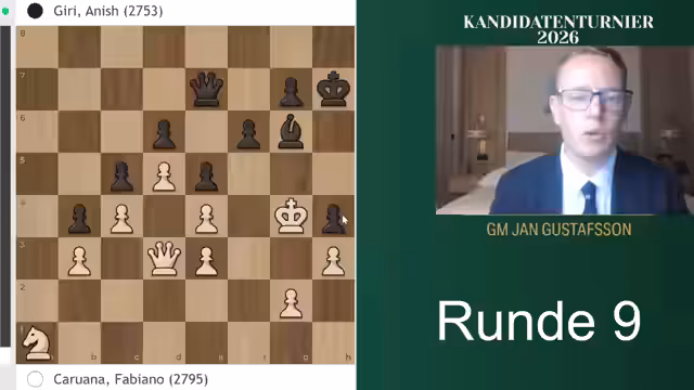 00:24:49Nachdem Giri sich einen klaren Vorteil erkämpft hatte, suchte Caruana eine Vereinfachung, die nur den Vorteil reduzierte, aber nicht beseitigte. Giri nutzte seine Chance und entschied die Partie mit einer hübschen taktischen Kombination. Zog den König nach h6 und drohte Matt, was zu einem Turmverlust führte. Dies bestätigte Giris Sieg und brachte ihn als letzten ernsthaften Verfolger zurück in Titelkampfnähe, während Caruanas Turnier weiter abrutschte.