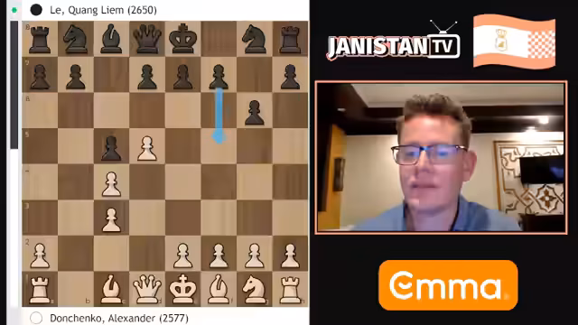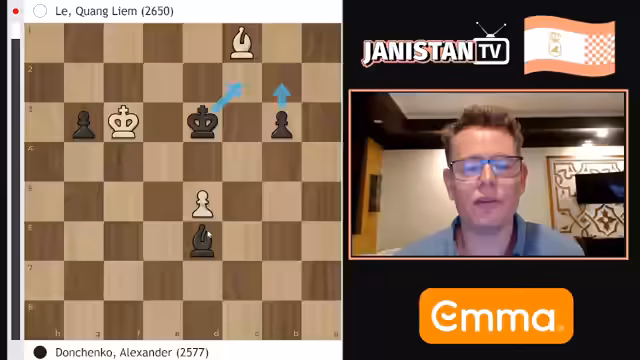 00:47:14Im Blitzschach zeigte Donchenko mit den schwarzen Steinen eine souveräne Leistung im Grünfeld-Indisch und erzwang ein Remis, was ihm erstmals die Dynamik nahm, ein Remis mit Weiß erzwingen zu müssen. Mit den weißen Steinen spielte Donchenko eine normale Partie, nutzte seine Vorbereitung aus früheren Runden und setzte Le Quang unter Druck. Trotz einiger Verwirrungsversuche seitens Le Quang behielt Donchenko die Kontrolle und spielte eiskalt den Zug h3, der einen Bauern opferte, um ein dämonisches Schachmatt zu erzwingen. Le Quang fiel auf diesen Trick herein, und Donchenko gewann die Partie nach einem wunderschönen Damenopfer und einer Springergabel, die ihm einen Turm mehr einbrachte. Damit besiegte Donchenko den starken Le Quang Niem und zog ins Viertelfinale des World Cups ein, eine unglaubliche Leistung, die seine mentale Stärke und sein Können unter Beweis stellte.
