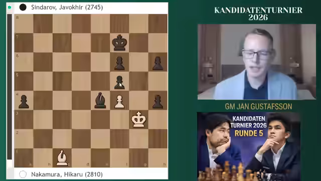 00:09:06Die Zusammenfassung für Runde 5 des Kandidatenturniers wird eingeleitet. Matthias Blühbaum spielte mit den schwarzen Steinen gegen Fabiano Caruana, während die Spitzenpaarung zwischen Hikaru Nakamura und Jaboukir Sindarov stattfand. Sindarov führt mit beeindruckenden 3,5 Punkten aus vier Partien. Nakamura ging mit den schwarzen Steinen als Außenseiter in die Partie, da er eine "Must-Win-Situation" annoncierte, um noch realistische Titelchancen zu wahren.
