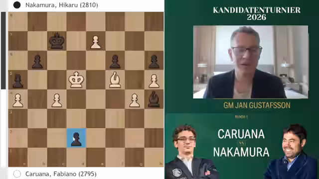 00:33:37Der Kommentator analysiert die erste Runde des Kandidatenturniers, das Duell zwischen den Top-Gesetzten Fabiano Caruana und Hikaru Nakamura. Er erläutert Caruanas Eröffnungsstrategie mit dem ungewöhnlichen Springerzug nach f3 und Nakamuras Antwort mit der Rechter-Öffnung. Er beschreibt, wie Caruana mit dem Zug b4 einen Bauern opfert, um Druck aufzubauen und Nakamura zu zwingen, eine vereinfachte Stellung anzunehmen.