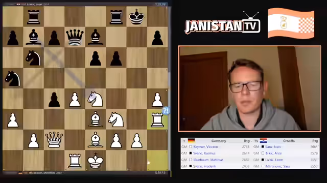 00:11:27Deutschland tritt gegen Kroatien an, Coach Kollas ist im Einsatz. Kroatien wird als starke Mannschaft eingestuft, Deutschland hat Elo-Vorteile. Frederik Swane eröffnet katalanisch gegen Sascha Martinovic. Swane wählt die Hauptvariante mit d4 c4, Martinovic antwortet mit Springer e5. Nach schnellen Tauschen (Springer c6, Bauer schlägt, Dame weicht) wird die Partie als theoretisch und solid eingestuft.