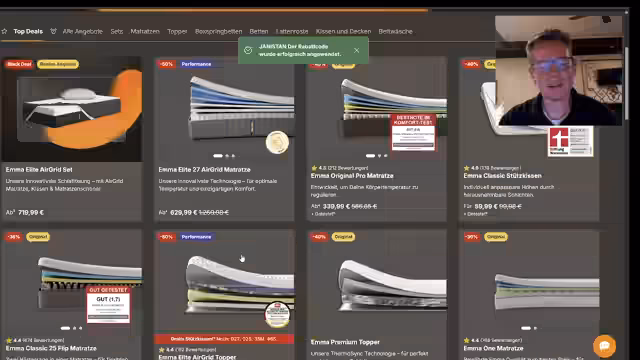 01:00:25Der Streamer wechselt das Thema und spricht über die Wichtigkeit der Schlafqualität, insbesondere im Kontext von Turnieren und Reisen. Er berichtet von seinem Umzug in ein neues Zimmer in Goa, das ein durchgehendes Bett bietet, im Gegensatz zu den zusammengeschobenen Einzelbetten in seinem vorherigen Zimmer. Diese Verbesserung der Schlafumgebung hebt er hervor und bewirbt gleichzeitig den Partner Emma Matratzen. Emma, die beliebteste deutsche Matratze, bietet Produkte wie Memory-Schaum-Matratzen und atmungsaktive Topper an. Der Streamer selbst hat den Elite Airgrid Topper erhalten und berichtet von positiven Erfahrungen, die seine Schlafqualität erheblich verbessert haben. Er weist auf eine aktuelle Aktion hin, bei der es bis zu 50% Rabatt auf Emma-Produkte gibt, plus weitere 5% mit dem Code 'Janistan'. Er betont, dass gute Matratzen, Stühle und Computer für Spieler und Streamer von entscheidender Bedeutung sind, da sie einen Großteil ihrer Zeit sitzend oder liegend verbringen. Er ermutigt die Zuschauer, die Angebote zu prüfen, auch wenn sie nur zum Stöbern vorbeischauen, da dies den Stream unterstützt.