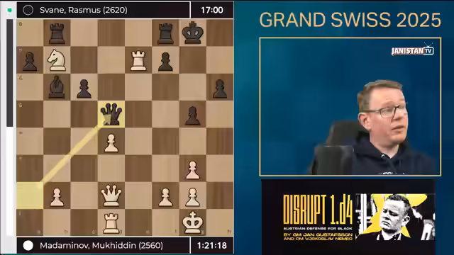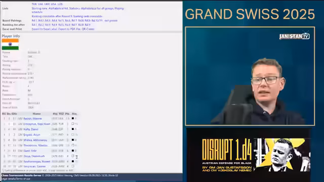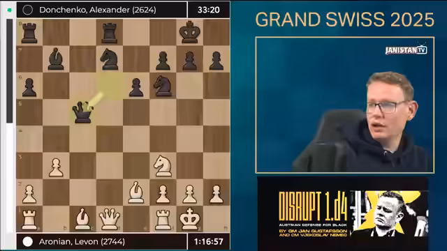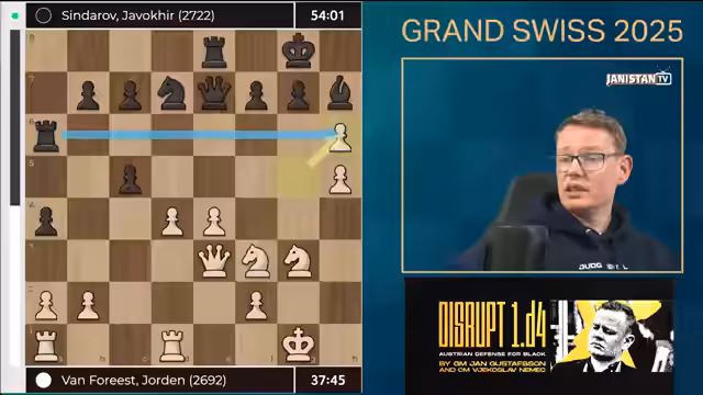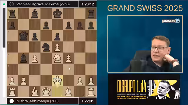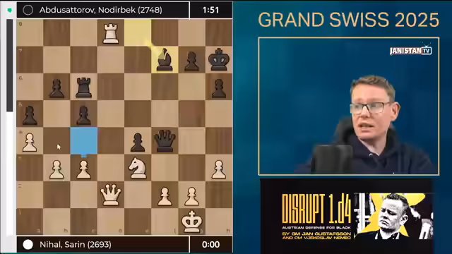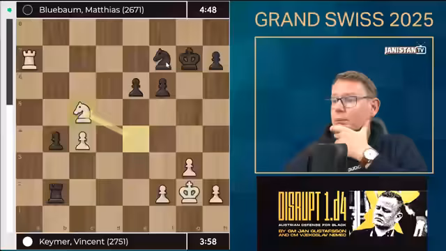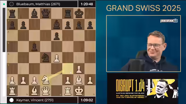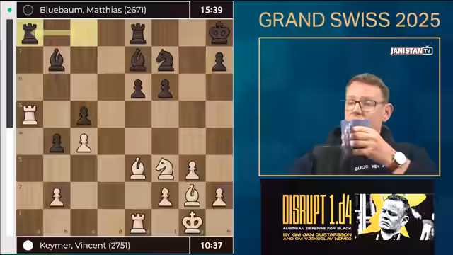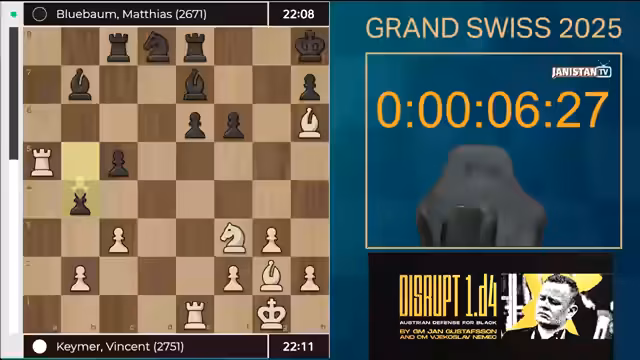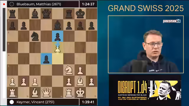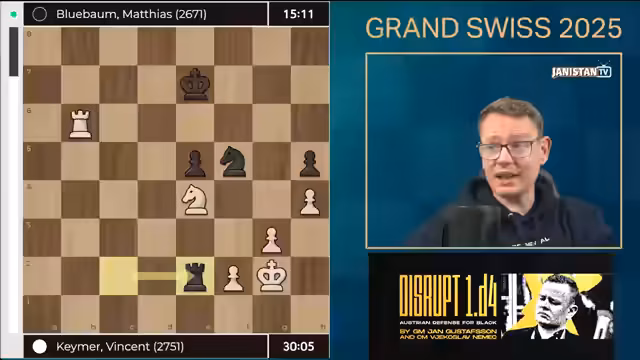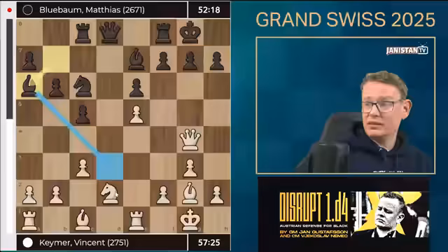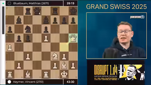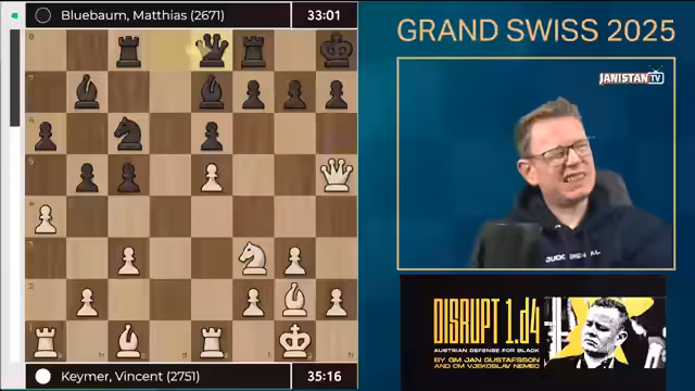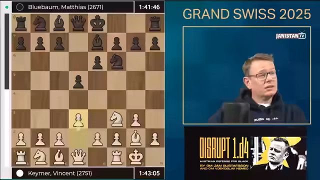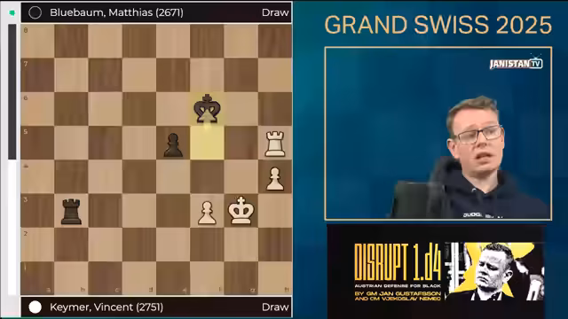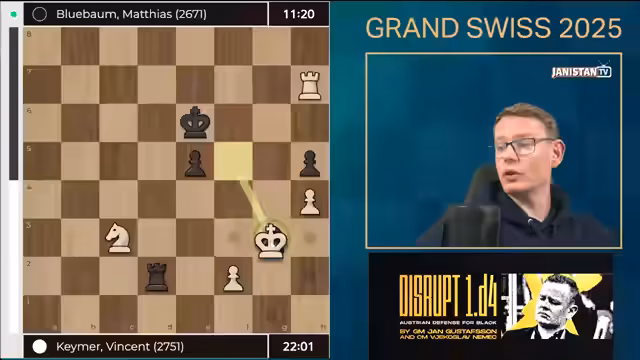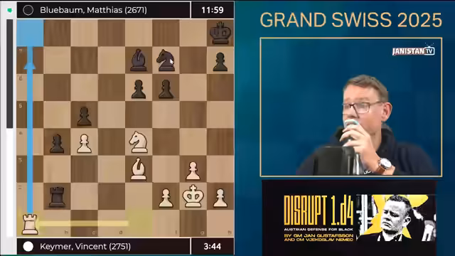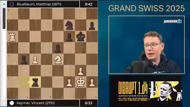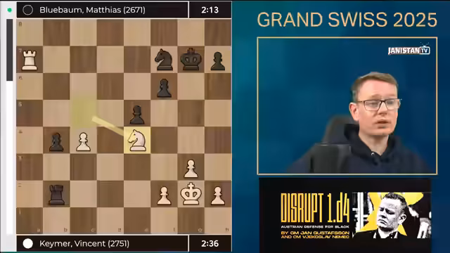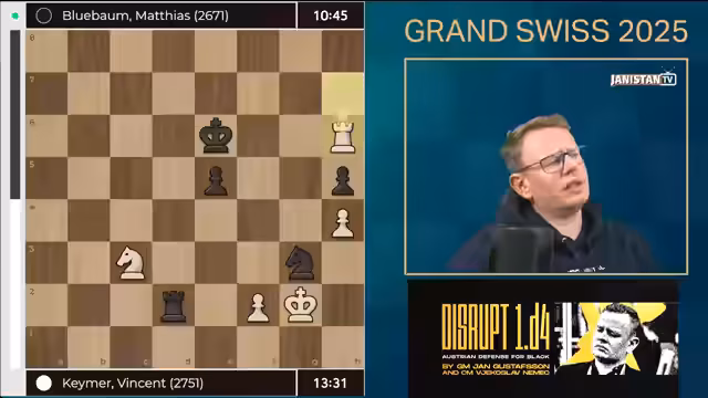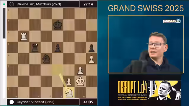 00:01:03In Runde 10 von 11 im Grand Swiss 2025 steht das deutsche Gipfeltreffen zwischen Vincent Keymer und Matthias Blübaum an Brett 2. Beide haben jeweils 6,5 Punkte aus 10 Partien und liegen auf geteiltem Ersten Platz. Keymer gewann gestern gegen Paramasudlu, und ein Sieg heute könnte einen der beiden sehr nahe an die begehrten zwei Kandidatenturnierplätze heranführen. Es ist ein Worst-Case-Szenario für die deutsche Auswahl, da beide Topspieler in diesem stark besetzten Feld von 100 Weltklasse-Spielern antreten.