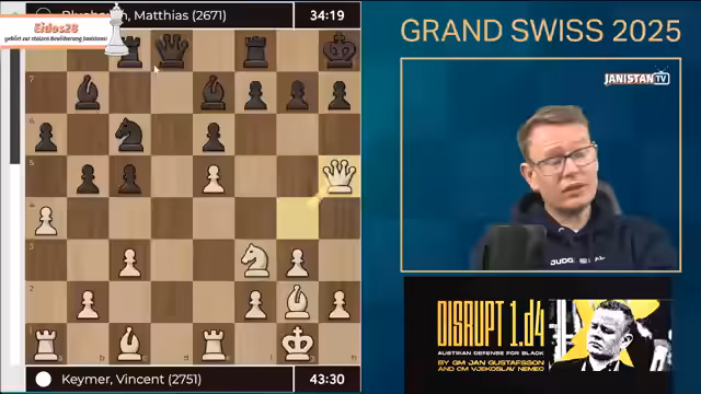 03:33:12Der Livestream eröffnet mit der Diskussion der Qualifikationsoptionen für das Grand Swiss 2025. Neben den drei Plätzen im World Cup wird die K.O.-Runde als noch lotterieartiger und fordernder beschrieben, wo Schnell- und Blitzschach-Skills entscheidend sind. Für die beiden deutschen Schachmeister Vincent Keimer und Matthias Blühbaum stellt die aktuelle Begegnung die beste Chance dar, sich für das Kandidatenturnier zu qualifizieren, da ein Sieg direkte Punktvorteile bietet. Die Stellung wird als strategisch vielschichtig analysiert, wobei die Frage im Vordergrund steht, wie jeder Spieler die Partie nutzen kann, um den respektiven Turnierzielen näher zu kommen.