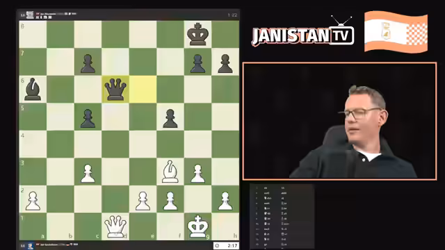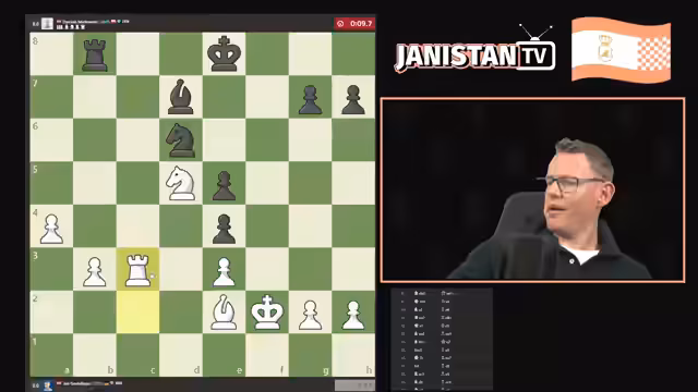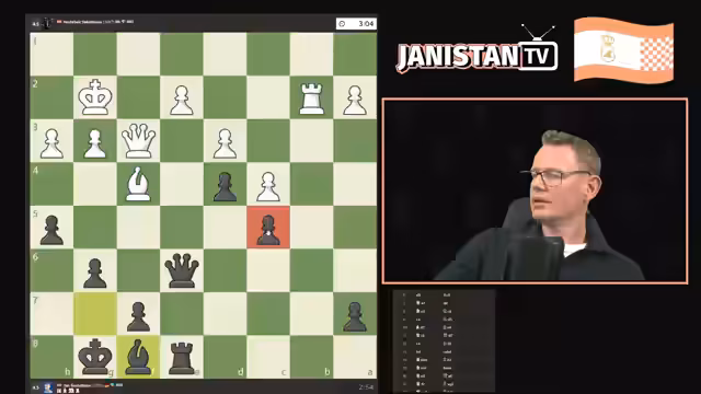 00:11:26Die erste Schachpartie beginnt, wobei der Gegner Damien Markowski ist und die Eröffnung 'Englisch' gespielt wird. Der Streamer analysiert die Stellung im Detail und diskutiert verschiedene strategische Optionen wie die Kontrolle der Mitte, den Einsatz von Springern und Bauernstrukturen. Er spricht über die Schwierigkeiten, gute Züge unter Zeitdruck zu finden, und erwähnt ein Problem mit der Technik, das ihn unterbricht, da er seinen Kaffee holen muss.