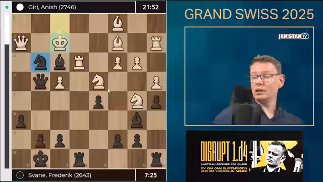 02:30:00In einer dramatischen Schachpartie zeigt Frederik Swain beeindruckendes Spiel gegen den Weltklassegegner Anish Giri. Swain opfert eine Figur für einen starken Angriff und steht damit deutlich besser. Die Partie verläuft sehr dynamisch mit vielen komplexen Zügen, wobei Swain als aggressiver 'Honigdachs' in Form beschrieben wird. Es bleibt bis zum Ende spannend, ob sein Angriff ausreicht, um gegen die starke Verteidigung von Giri zu gewinnen, was für seinen Eloititel und das Turnierergebnis entscheidend wäre.