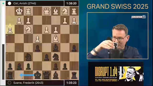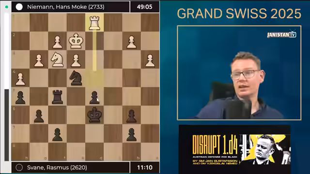 03:55:16Rasmus Svane führte eine extrem defensive Partie gegen Hans Niemann, in der er nach einer ungenauen Eröffnung in eine schwierige Position geriet. Die Stellung war von langer Folter geprägt, mit Niemanns solidem Technik-Spiel, das Svane unter Dauerdruck setzte. Svane versuchte, mit Läufer- und Turm-Manövern einen Gegenschlag zu preparieren, doch Niemann kontrollierte das Brett und verhinderte jede Aktivität. Die Engine bewertete Svanes Position zeitweise als hoffnungslos, doch er kämpfte ausdauernd weiter und hoffte auf Fehler des Gegners. Trotz der schwierigen Umstände zeigte Svane typische Stärken im Stellungsspiel, doch die Partie drohte in eine langwierige Niederlage zu münden. Der Streamer betonte, dass Endspieltaktik und Zeitmanagement für Svane entscheidend würden.