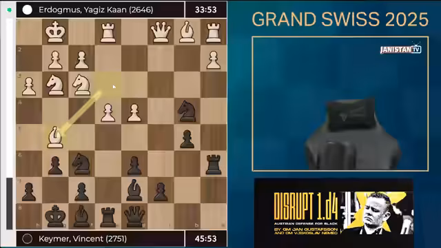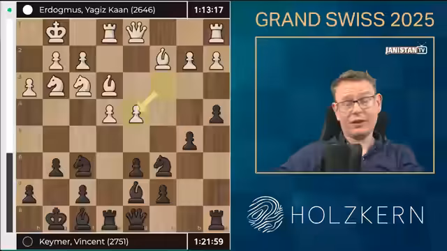03:52:17Nach einer Phase intensiver Manöver befreite sich Vincent Keymer aus seiner anfänglich hoffnungslosen Position gegen Erdomus. Der junge Türke spielte zu defensiv, statt den direkten Gewinnweg zu verfolgen, und erlaubte Keymer so, den Druck zu reduzieren. Keymer nutzte die Zeitnot des Gegners, um mit Springer-Zügen und Turm-Operationen die Stellung zu stabilisieren, bis er eine ausgeglichene Endspielsituation erreichte. Obwohl er zeitweise wieder schlechter stand, hielt er durch und erzielte schließlich Remis durch Zugwiederholung. Die Partie illustrierte Keymers Erfahrung im Umgang mit Druck, auch wenn seine anfängliche Risikostrategie fragwürdig blieb. Der Streamer lobte die Resilienz, kritisierte aber die unklare Eröffnungswahl.
