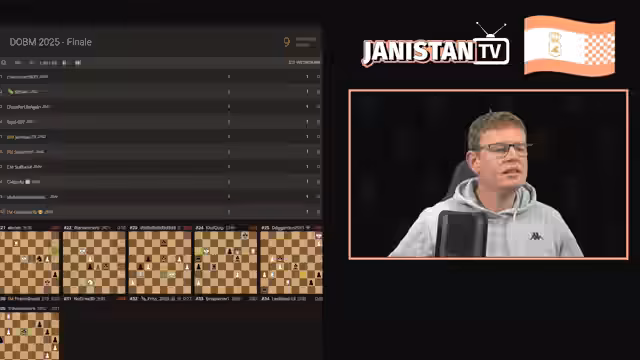00:37:00Positive Rückmeldung zum Deutschen Schachbund für die Online-Veranstaltung. Kritik an der Turnierregelung: Preise können nur an deutsche Bankkonten überwiesen werden, was internationale Teilnehmer ausschließt. Ein aufstrebender Gegner ('Einspieler 1') wird als schwer zu stoppende Dominanzfigur beschrieben, die nach späterem Einstieg immer noch gewinnt. Der Streamer reflektiert seine eigene schwache Leistung ('mein Spiel lässt zu wünschen übrig') und seine Position (Platz 11).
