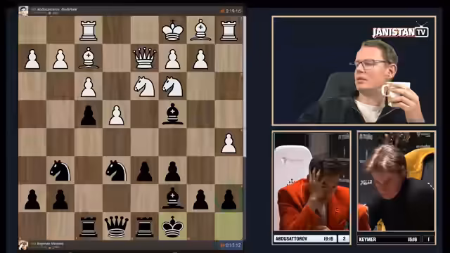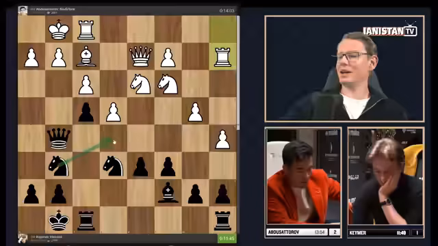00:00:00Der Stream beginnt mit Kommentaren zum Freestyle Chess, bei dem Figuren auf beliebigen, gleichfarbigen Feldern landen dürfen. Der Kommentator analysiert die erste Partie zwischen Vincent Keymer und Nodirbek Abdusattorov. Keymer mit den weißen Figuren hat eine stabile Stellung, während Abdusattorov mit Schwarz versuchter Kompromissierung, aber auch eine riskante Haltung einnimmt. Der Kommentator stellt die Frage, ob Keymer mit der schwarzen Figuration überhaupt gewinnen kann, um ins Finale vorzudringen. Die Spannung im Kampf um Platz drei ist von Anfang an spürbar.