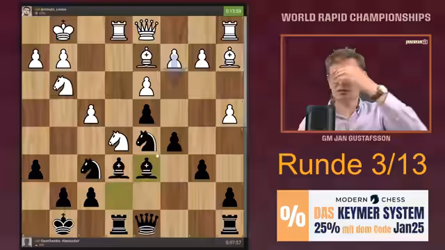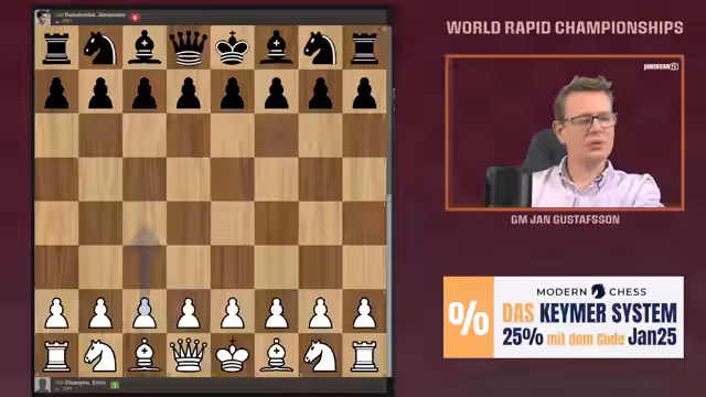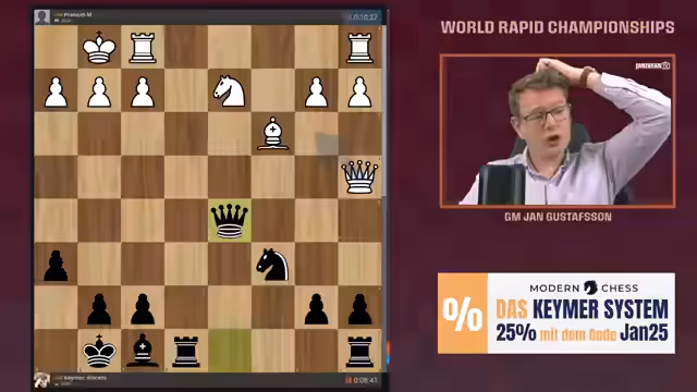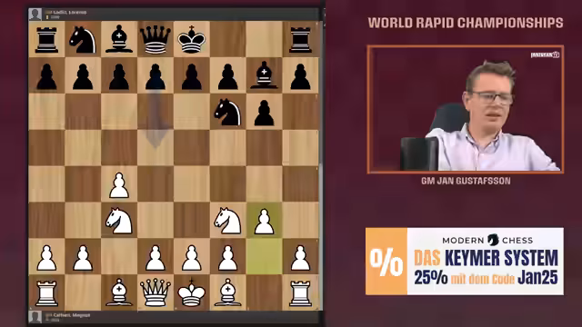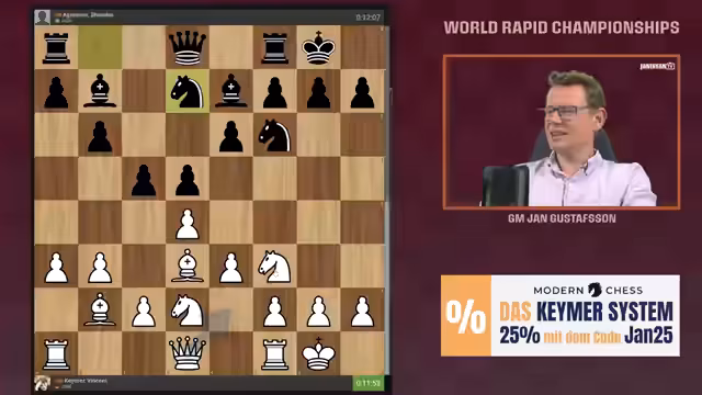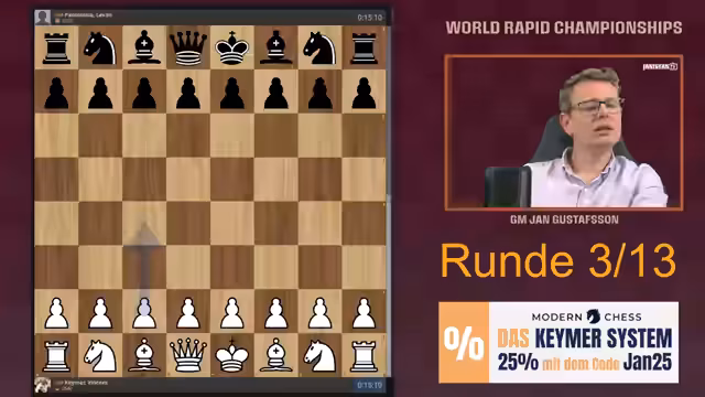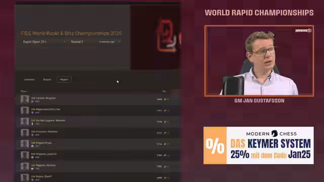 00:11:03Jan Gustafsson eröffnet den Stream zur Schnellschach-Weltmeisterschaft und begrüßt die Zuschauer. Er stellt die Teilnehmer vor, darunter Top-Spieler wie Magnus Carlsen, Vincent Keymer und andere internationale sowie deutsche Großmeister. Als Co-Kommentator wird Rasmus Svane genannt. Keymer wird als Vize-Weltmeister 2022 und Nummer 4 im klassischen Schach hervorgehoben, mit Hoffnungen auf einen Angriff auf die Spitze. Jan erklärt, dass keine Kameras von vor Ort verfügbar sind und die Übertragung sich auf die Schachbretter konzentrieren wird. Der Start wird voraussichtlich aufgrund von Anti-Cheating-Maßnahmen leicht verzögert erwartet.