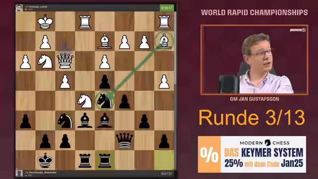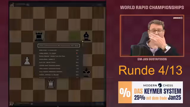 03:55:52Vincent Keymer wählt gegen Nils Panzulaya eine unkonventionelle Eröffnung mit H4, steht aber früh schlecht. Panzulaya erlangt einen strategischen Vorteil durch bessere Figurenentwicklung. Keymer kämpft sich jedoch taktisch zurück und erhält später sogar eine Gewinnchance. Nach wildem Schlagabtausch und Figurenverlusten auf beiden Seiten endet die Partie remis, wobei Keymer aus einer eigentlich verlorenen Position noch einen Halbpunkt herausgeholt hat.