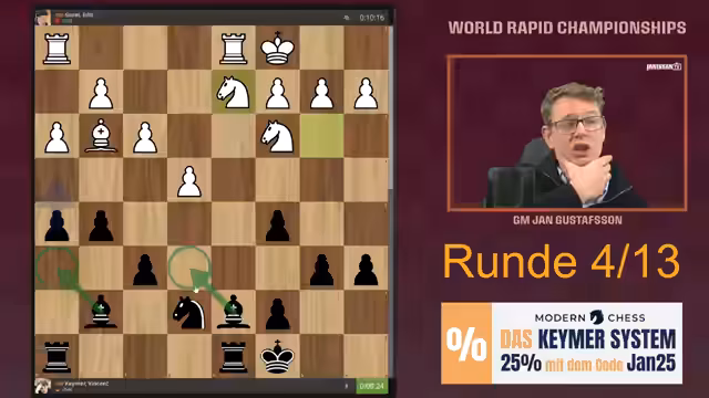 05:14:16Die Analyse der deutschen Rapid-Topspieler ergibt, dass Vincent Keymer (Weltklasse im Klassischen, Top 10 im Rapid), Matthias Blübaum (Spezialist für Schnellschach) und Felix Winselmann (deutscher Blitzmeister) die stärksten Medaillen Hoffnungen sind. Keymer zeigt in Runde 4 gegen Gürel eine solide, aber nicht dominante Stellung mit Läuferpaar. Warnows Partie gegen Madaminow verläuft unauffällig, Donchenko agiert positionell gegen Becerra Morato. Turniermäßig bleibt Carlsen mit 3/3 führend, während deutsche Teilnehmer bei 2/3 aufholen müssen. Die Diskussion betont die Bedeutung der nächsten Runde für die Spitzengruppe.
