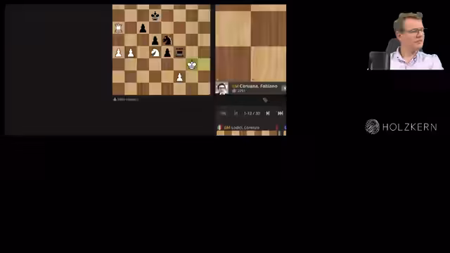 00:31:04Akmanov spielt den soliden Zug ...Se4, und die Partie bleibt ausgeglichen. Keymer vermeidet den Springerabtausch und hält die Optionen offen. Nach einigen weiteren Zügen wird deutlich, dass Keymer seine typische Spielweise zeigt: Er sucht nach komplizierten Stellungen, um dem Gegner Fehler abzuringen, steht aber nicht zwingend besser. In der Folgezeit entwickelt sich ein taktisch schwieriges Mittelspiel mit vielen möglichen Varianten. Keymer versucht, durch unerwartete Züge wie g4 für zusätzliche Unruhe zu sorgen, riskiert dabei aber seine eigene Stellung. Der Computer zeigt an, dass die Position kompliziert bleibt und Keymer nicht klar besser steht.