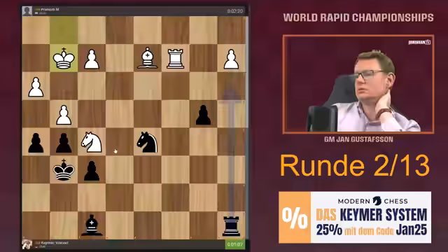 01:21:40In der ersten Runde der Schnellschach-WM erzielte Vincent Keimer einen wichtigen Sieg. Der Streamer bemerkte, dass Keimer trotz einer gefährlichen Stellung den vollen Punkt holte. Es gab jedoch Zweifel an der Korrektheit einiger Ergebnisse, insbesondere bei Alexander Donchenko, der angeblich aus einer gewonnenen Stellung verloren hatte. Auch andere Ergebnisse wie der Sieg von Rasmus Svane wurden bestätigt, wobei der Streamer die Zuverlässigkeit der Ergebnisveröffentlichungen in Frage stellte. Die Runde zeigte, dass die Deutschen mit drei Siegen starteten.