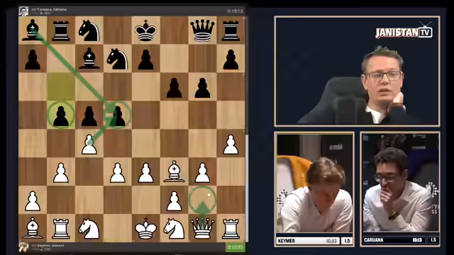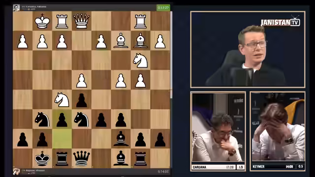 00:00:00Der Stream beginnt mit technischen Schwierigkeiten, die jedoch schnell behoben werden. Es wird die dritte Partie des Halbfinals zwischen Vincent Keymer und Fabiano Caruana angekündigt. Das Stand ist ausgeglichen mit 1,5 zu 1,5, was Keymer unter Druck setzt, da er gewinnen muss, um das Finale zu erreichen. In der Eröffnung wählt Keymer eine ungewöhnliche Strategie und verpasst computerbasierte Chancen. Caruana nutzt dies aus, um eine komfortable Stellung mit Bauernmehrheit im Zentrum zu entwickeln. Die Kommentatoren bewerten die frühere Phase als für Weiß (Caruana) vorteilhaft und Keymers Spielstil als unkonventionell und riskant.