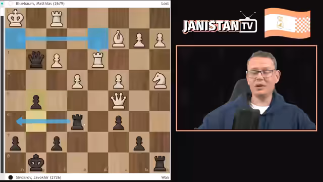 00:50:13Der Spielstil Sindarovs wird als extrem honigdachs-aggressiv und kompromisslos charakterisiert. Dies belegt der Streamer anhand einer analysierten Partie gegen Matthias Blühbaum, in der Sindarov objektiv schlechter stehend dennoch eine komplizierte Kampfsuche aufnimmt. Sein hohes taktisches Talent wird durch einen spektakulären Sieg in der Partie unterstrichen, bei der er eine komplexe Kombination zum Mattangriff erfolgreich umsetzt und einen Bauernopfer riskiert.