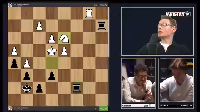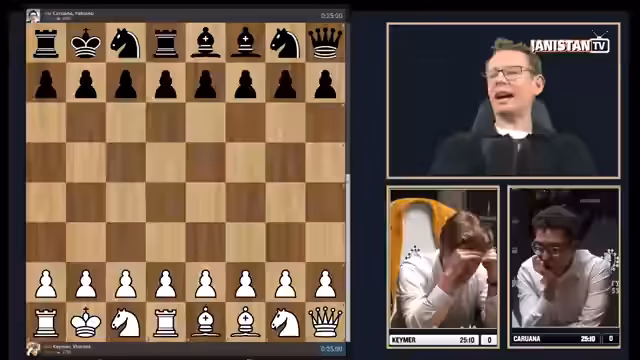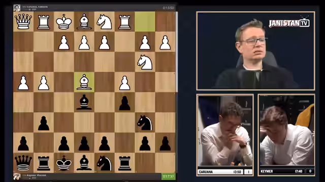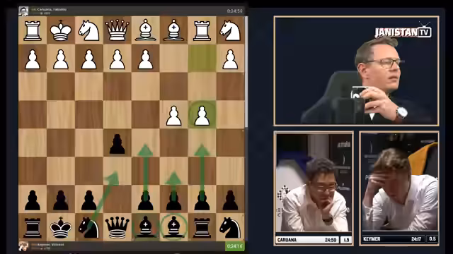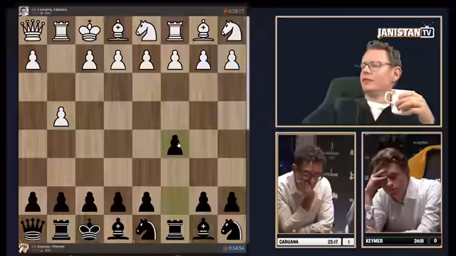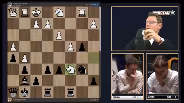 00:01:14Die erste Partie beginnt mit einer ungewöhnlichen Startstellung, in der Keymers Dame in der Ecke gefangen ist. Keymer spielt zögerlich, während Caruana direkt die Initiative ergreift und aktivere Figuren stellt. Caruana entwickelt einen strategischen Druck auf die schwache Bauernstruktur von Keymer, die sich infolge eines frühzeitigen Zuges F2 und C3 auflöst. Keymer gerät schnell in einen schwierigen, hoffnungslosen Kampf, den er trotz heroischem Kampf und einer verpassten Mattchance letztendlich verliert.