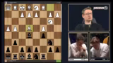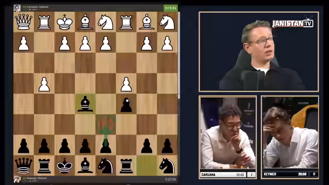 01:42:11Zu Beginn des Streams wird die ungewöhnliche Eröffnungssituation angesprochen, die Caruana sichtlich verunsichert, da er Zeit verliert. Es folgen Informationen zu Fabiano Caruana, der in St. Louis lebt und seine Nationalität von Italien in die USA wechselte. Dies wird im Kontext der Schachszene in St. Louis erklärt, die maßgeblich von Rex Sinkefield gefördert wird und viele Topspieler angezogen hat, darunter Levan Aronian und Lenier Dominguez.