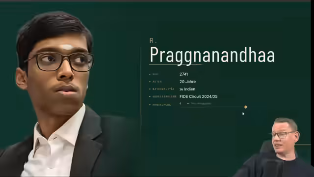 Es wurde die Vorstellung der Kandidaten für das bevorstehende Turnier begonnen. Im Zentrum stand der indische Großmeister Pragnananda. Sein beeindruckender Karriereweg und sein risikoreicher Spielstil wurden beleuchtet. Gleichzeitig wurde seine aktuelle Form als problematisch eingestuft und seine Siegchancen auf etwa 11 % taxiert.