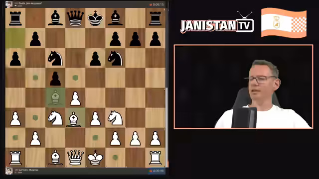 00:00:54Der Streamer begrüßt die Zuschauer und zeigt sich begeistert vom Finale der Chess.com Open zwischen Magnus Carlsen und Jan-Krzysztof Duda. Er beschreibt das Format, bei dem Carlsen bisher alles gewonnen hat und Duda somit unbedingt gewinnen muss, damit Carlsen nicht gewinnt. Zu Beginn der Partie analysiert der Kommentator Carlsens ungewöhnliche Eröffnungszüge wie Springer nach A3 und Baut nach C3, die eher dem 'Rage-Baiting' als solidem Schach entsprechen. Duda verteidigt sich souverän und erreicht eine ausgeglichene Stellung.