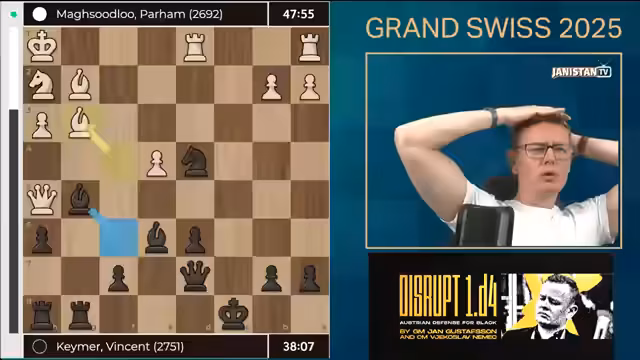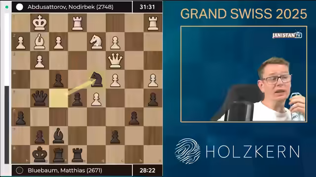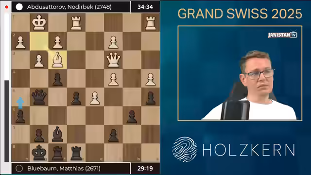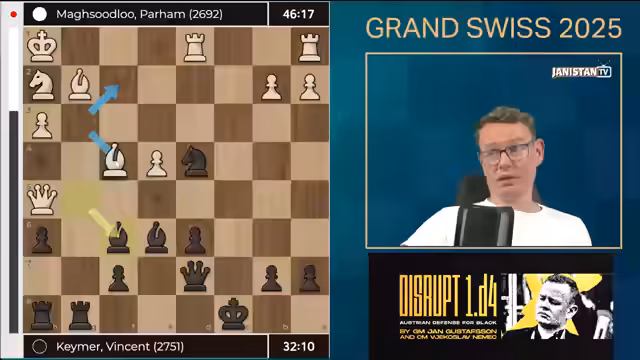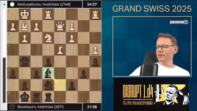 00:00:01Nach anfänglichen technischen Problemen wurde der Stream erfolgreich gestartet. Der Moderator begrüßte das Publikum zur Grand Swiss 2025 Runde 9 und erwähnte, dass alle technischen Hürden nun behoben seien. Es folgte ein kurzer humorvoller Einwurf zur eigenen Geschicklichkeit, bevor der Fokus auf die aktuelle Schachpartie gelegt wurde. Die Eröffnung der Spielparteien wurde als harmonisch beschrieben, mit einem Fokus auf die Zugfolgen Bauer nach D5 und Bauer nach F5.