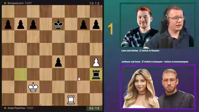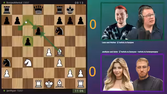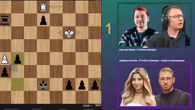 00:31:53Das erste Match startet mit Team Bonschwa (Matteo/Leon) als 'Brain' und Team Jenyan (Asta/Jen) als 'Hand'. Von Anfang an zeigt sich die überlegene Schacherfahrung von Team Bonschwa. Durch geschickte Züge und Fehler des Gegners, insbesondere eine frühe, riskante Königsbewegung und das Verpassen kritischer Blockaden, erzielen sie einen entscheidenden materiellen Vorteil. Team Jenyan verliert frühzeitig seine Dame und kann sich nicht mehr erholen, sodass das Match relativ klar an Team Bonschwa geht.