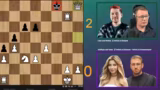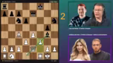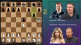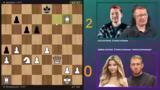 01:02:52Für die zweite Partie wechseln die Teams die Rollen: Asta und Leon sind jetzt die Brains, während Matteo und Jenyan die Hände sind. Das Spiel ist von Anfang an ausgeglichener und dynamischer. Es kommt zu einem heftigen Figurentausch, der das Spiel wieder öffnet. Ein entscheidender Moment entsteht, als ein strategischer Fehler die Stellung komplett verändert. Team Jenyan/Asta nutzt die entstandene Schwäche, um in den Materialcount aufzuholen und das Spiel aktiv zu gestalten, was für große Spannung sorgt.