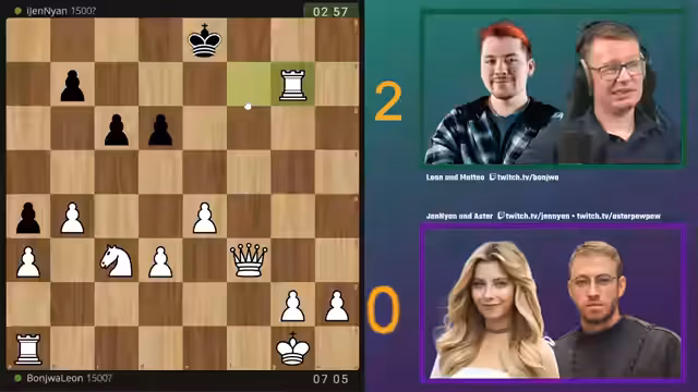 00:32:43Die erste Partie beginnt zwischen den Teams Matteo/Leon und Jenyan/Asta. Jenyan, als Brain, nennt zuerst 'Bauer', woraufhin ein Bauer nach E4 gezogen wird. Jan analysiert das Spielgeschehen live. Er kritisiert, dass der schwarze König früh in die Mitte gezogen wird, was als riskant gilt. Die Analyse beleuchtet taktische Fehler beider Seiten, insbesondere den Verlust der weißen Dame durch unvorsichtige Züge. Team Bonjwa gewinnt diese Partie letztendlich durch einen klaren Materialvorteil und einen starken Mattangriff.