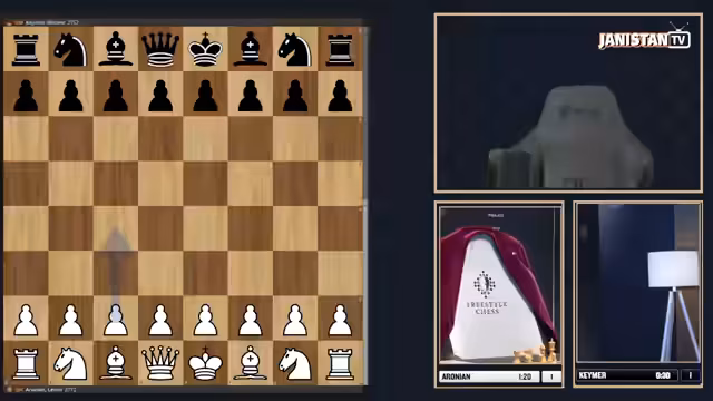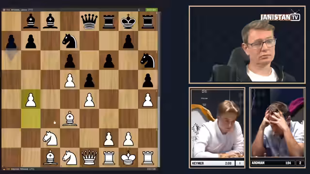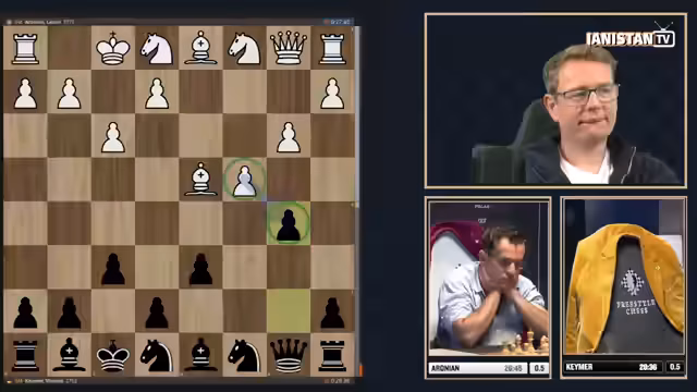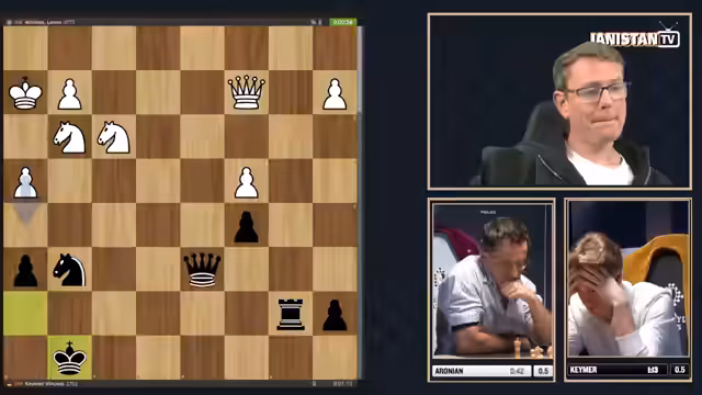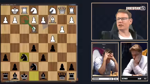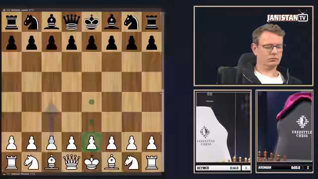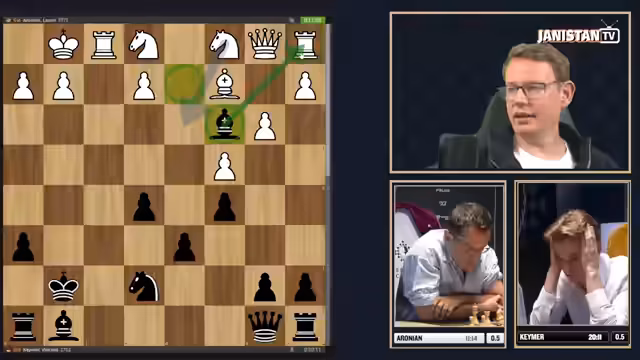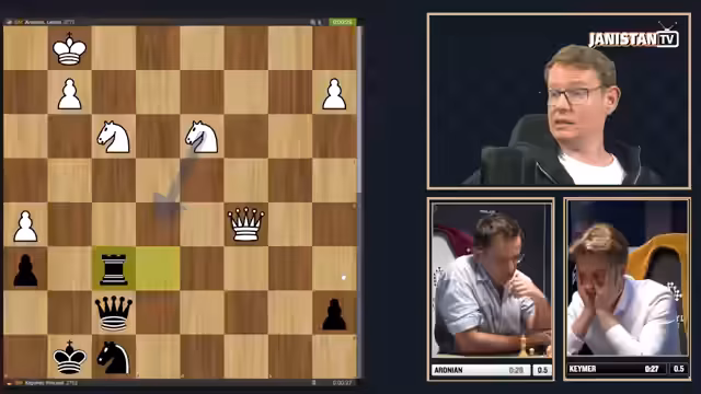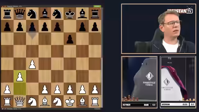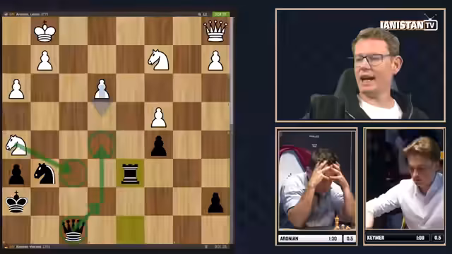 00:22:31Keymer zeigt seine starke Boardvision mit dem Zug Läufer nach A5, der die weißen Figuren einsperrt und eine Turmjagd ermöglicht. Dieser Zug ist ungewöhnlich im normalen Schach, zeigt aber Keymers Stärke im Freestyle-Format, Disharmonien in der gegnerischen Stellung schnell zu erkennen. Aronian gerät unter Druck, da der Computer einen Vorteil für Keymer anzeigt. Die Zeitkontrolle von 30+15 Sekunden pro Zug trägt zur Spannung bei. Keymer schlägt auf D2, und Aronian reagiert mit Läufer schlägt F6, was zu einer materiellen Überlegenheit für Schwarz führt, obwohl die Stellung unklar bleibt. Aronian wirkt unzufrieden und kratzt sich am Kopf, während Keymer weiterhin computerähnliche Züge macht.