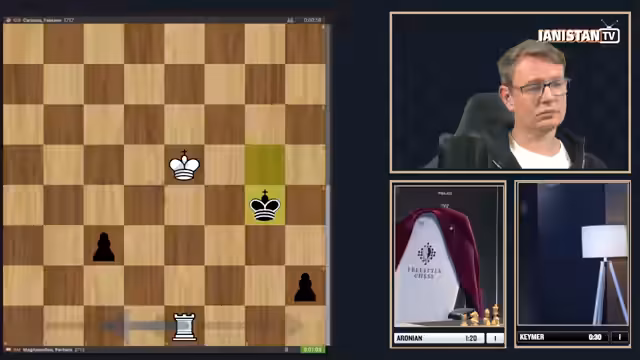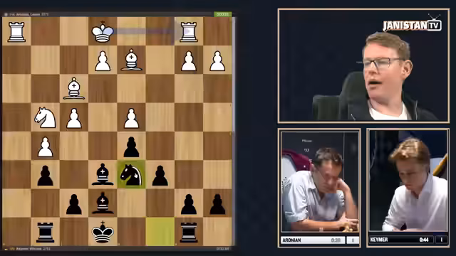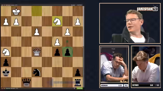 01:15:42Vincent Keymer hatte eine aussichtsreiche Stellung und drohte mit einem Gewinn. Doch er übersieht einen subtilen Zug von Aronian, der mit Springer nach H6 ein Dauerschach erzwingt und damit das Unentschieden sichert. Kommentator und Zuschauer zeigen sich von diesem intelligenten Rettemanöver beeindruckt. Für Keymer ist dies bitter, da er in der vorausgegangenen Partie klare Chancen hatte, das Halbfinale zu gewinnen. Die Entscheidung fällt nun in den Blitz-Tiebreak.