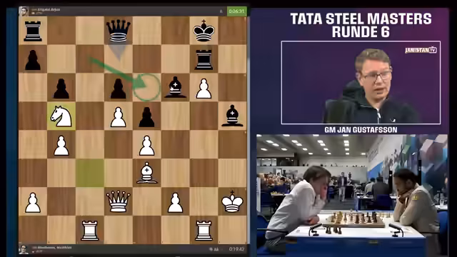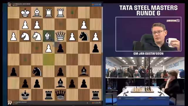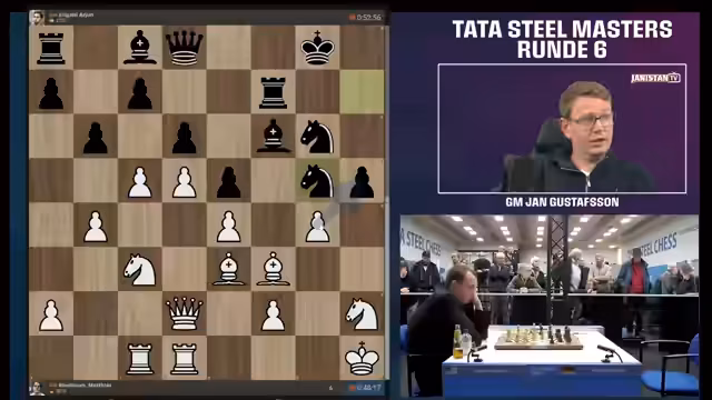 Nach Runden fünf bei den Tata Steel Masters treten Hans Niemann und Vincent Keymer an. Beide Spieler finden sich in einer strategisch komplizierten Stellung wieder. Nach einer taktischen Wendung und einem Remishandel bleibt das Duell spannend und wird live analysiert.