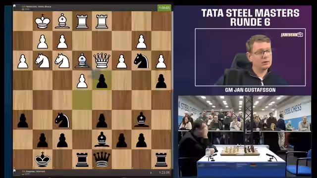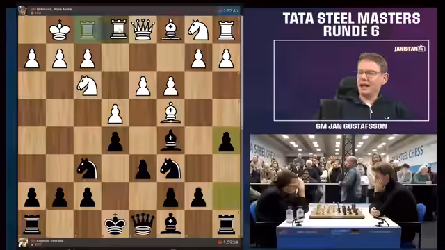 00:00:00Bei den Tata Steel Masters führt der US-Amerikaner Hans Niemann nach fünf Runden mit 3,5 Punkten und hat es mit Vincent Keymer zu tun, der aufschließen kann. Die Partie beginnt mit der Italienischen Eröffnung, die überraschend in eine komplexe strategische Stellung mündet. Keymer überrascht Niemann mit der ungewöhnlichen Idee Läufer nach c8, die zu einer Stellung mit beidseitigem Zugzwang führt und Niemann aus dem Buch wirft.