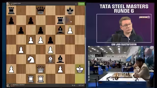 01:51:46Neben der Hauptpartie wird auch die Partie des deutschen Großmeisters Matthias Blühbaum im Fokus gesehen. Er befindet sich in einer für ihn schwierigen und komplexen Stellung gegen den Top-Spieler Arjun Erigaisi. Kommentatoren vermuten, dass Matthias mit den schwarzen Steinen sogar einen Vorteil haben könnte, muss jedoch mit sehr starken Nerven rechnen, da seine Königsstellung exponiert ist. Es ist eine wilde Partie, in der ein Fehler den Verlust bedeuten kann, und Matthias kämpft um jeden Bauern, was sein typischer Spielstil ist.