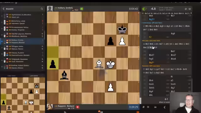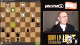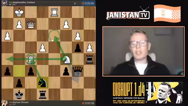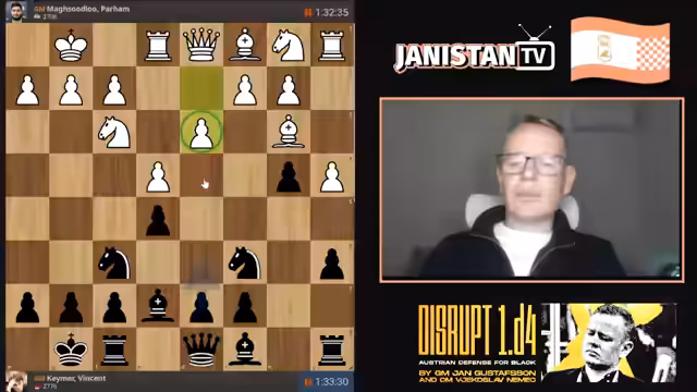 00:05:18Der Stream beginnt mit der Live-Berichterstattung vom Superturnier in Prag, bei dem Vincent Keimer antritt. Nach anfänglichen technischen Anpassungen wird die Partie von Keimer mit den schwarzen Steinen gegen Paramahm Masoudou analysiert. Keimer wählt die Marshall-Eröffnung, die als seine Hauptwaffe gilt. Die Kommentatoren diskutieren alternative Züge wie B4, von dem sich Keimer aufgrund ästhetischer Bedenken distanziert und sich für den soliden Zug B7 entscheidet. Die Eröffnungsphase gestaltet sich als Standardpartie, bei der beide Seiten entwickeln und ihre Positionen festigen.