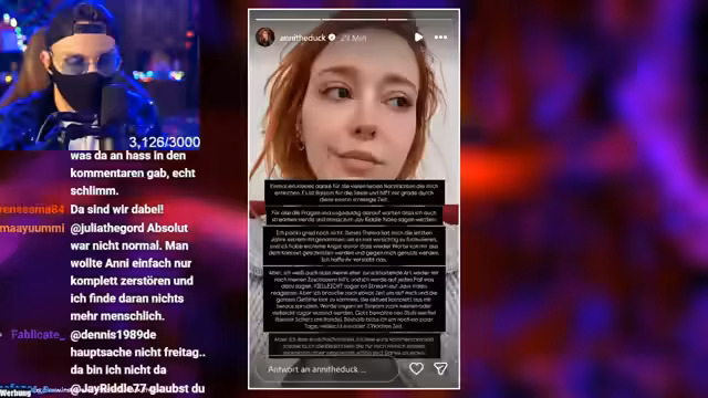 01:12:20Anni the Duck hat sich erstmals zur Entwicklung geäußert und betont, dass sie das Thema extrem mitgenommen hat. Sie zeigt sich dankbar für die Unterstützung, hat aber Angst vor einer missbräuchlichen Verwendung ihrer Worte. Sie braucht noch Zeit, um sich klar zu positionieren und könnte möglicherweise auf einem Stream auf das Video reagieren. Die Community ist gespannt auf ihre eventualen Stellungnahme.