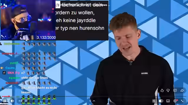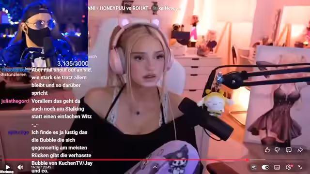 01:59:11Es wird über Veni kritisch diskutiert, der nach Auseinandersetzungen mit Honeypoo auf Twitter eine Ausnahme beweisen zu wollen scheint, nachdem er im Zusammenhang mit Stalking-Vorwürfen Knossi kritisiert hatte. Veni postete einen 'Wall of Text', in dem er sich gegen Kritik verteidigte, aber auch Honeypoo beleidigte. Honeypoos wurde jedoch als aus dem Kontext gerissen zurückgewiesen. Der Streamer bezeichnet Venis Verhalten als plump und schädigend für die eigentliche Botschaft, derer sich Veni eigentlich annehmen wollte.
