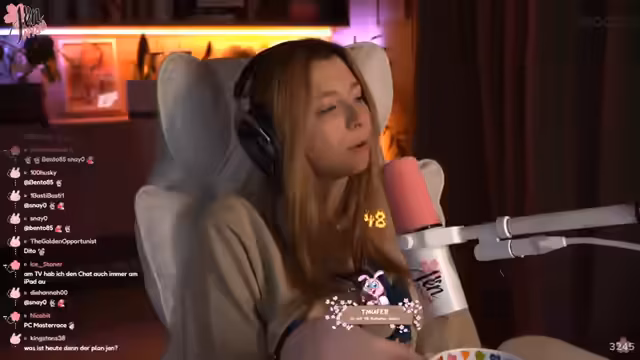 00:15:37Der Stream beginnt mit einem entspannten Sonntagabend. Die Streamerin begrüßt ihre Zuschauer und schildert ihren perfekten Nachmittag: ein langes Ausschlafen bis 13:30 Uhr, ein heißes Bad, Ramen essen und gemütliches Verbringen auf der Couch mit Kaffee, Kuscheldecke und Philips Hue-Beleuchtung Dabei schaute sie Avatar: Der Herr der Elemente, insbesondere ihre Lieblingsfolge, und genoss die Lofi-Musik. Ihr Sonntag ist ein Gönntag, an dem sie es sich gut gehen lässt, weshalb sie den Stream von ursprünglich 14 Uhr auf 19 Uhr verschoben hat.